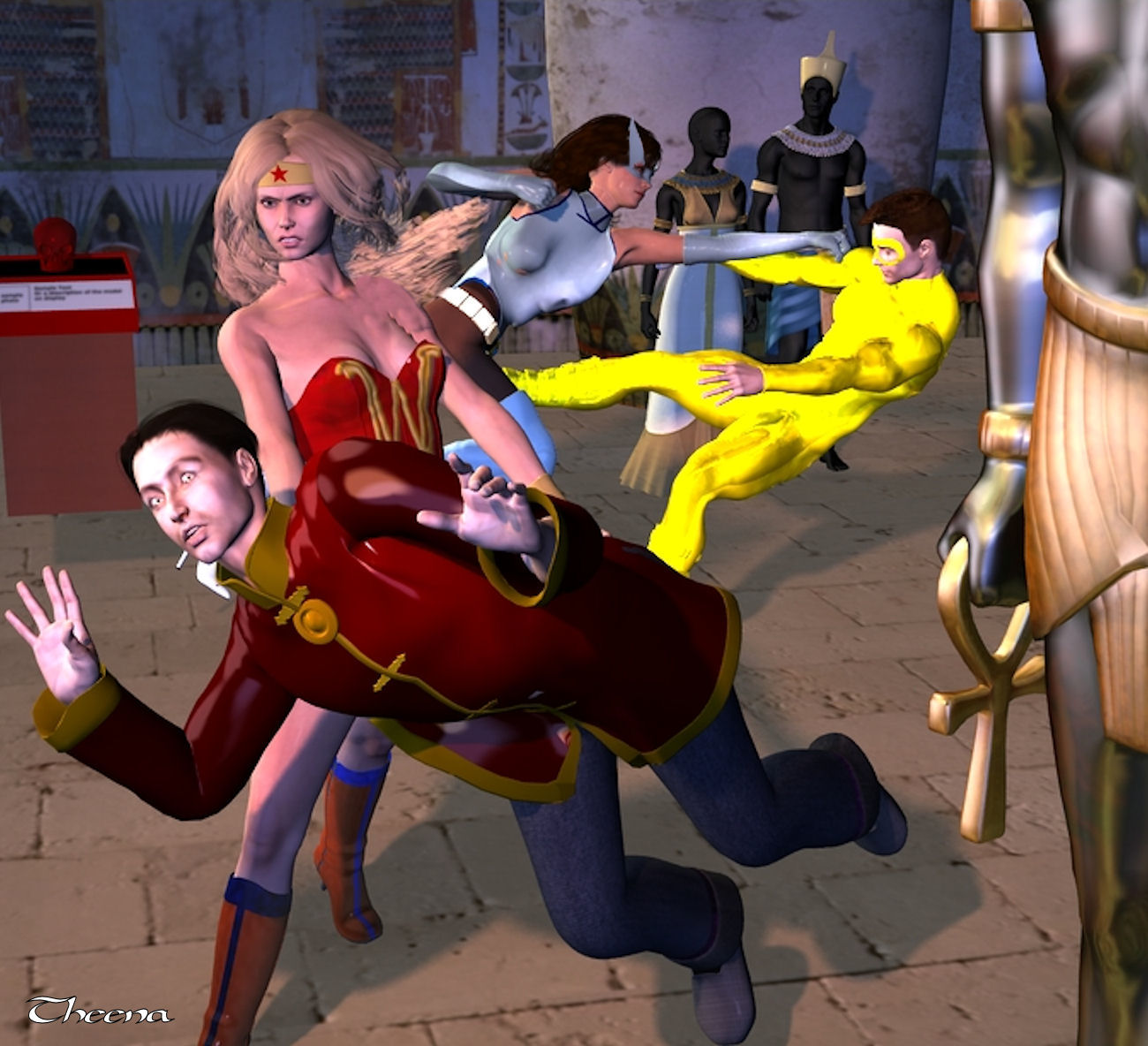 Goldenfist stood up and strode close. "You will not resist me, White Owl," he commanded. His rough hand cupped my rear end, rubbing it with delight. "I've had Ultra Woman this close so many times," he continued. "I think it's time for someone fresh. But she IS your nemesis, Mirabilis?"